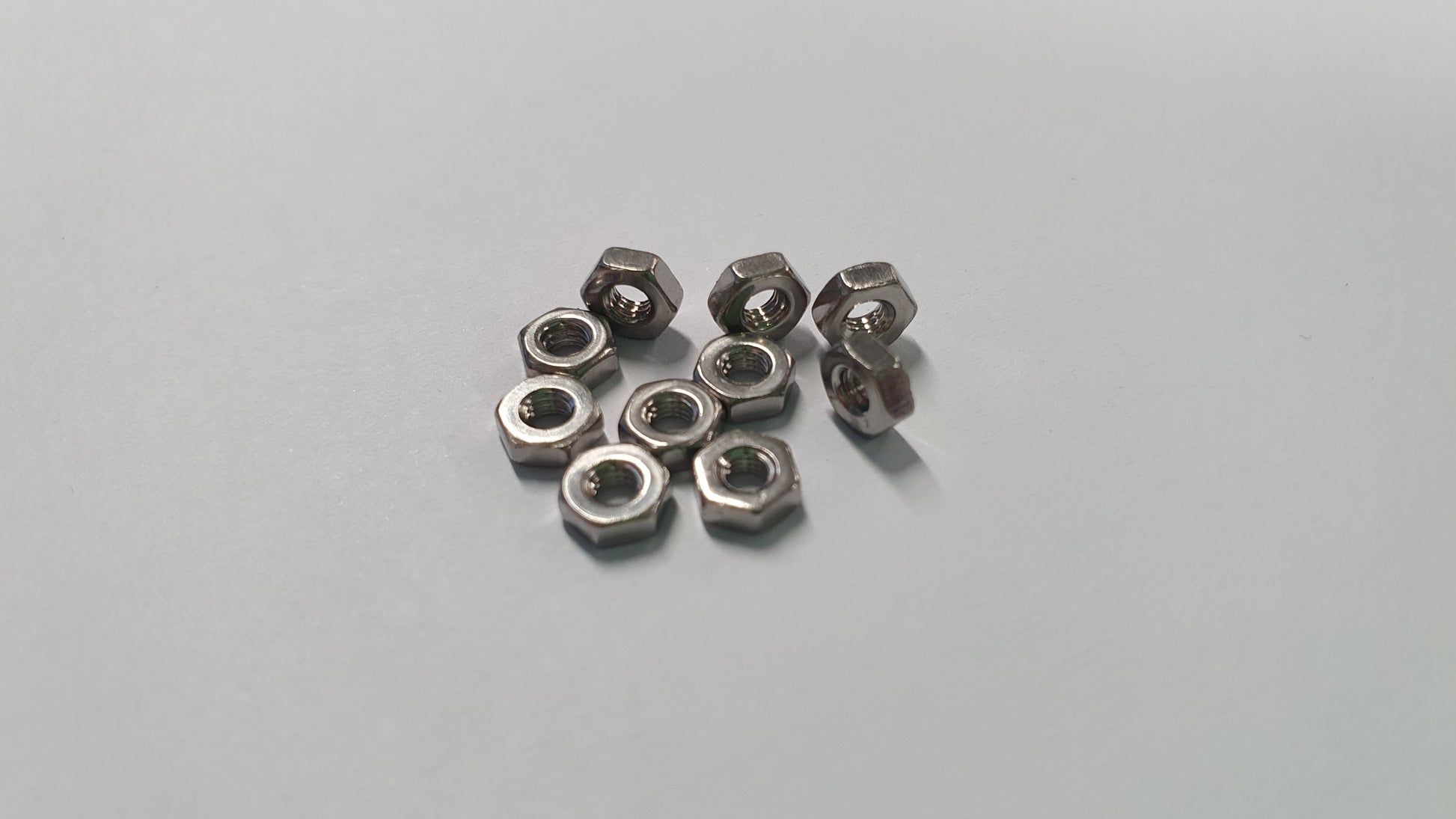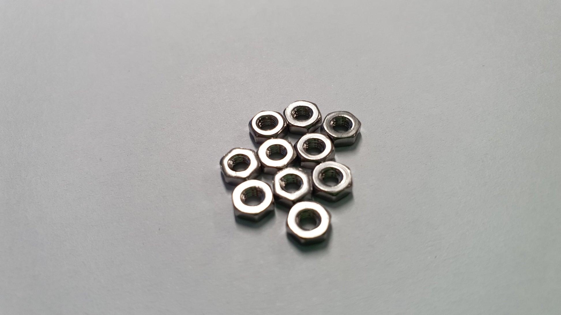 Metric M2.5 hexagonal full nuts with 0.45mm thread pitch. Head is 5.0mm across flats.