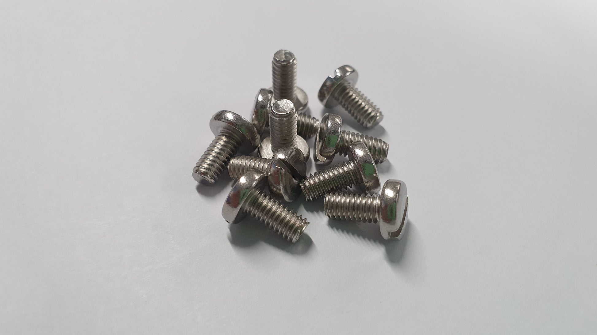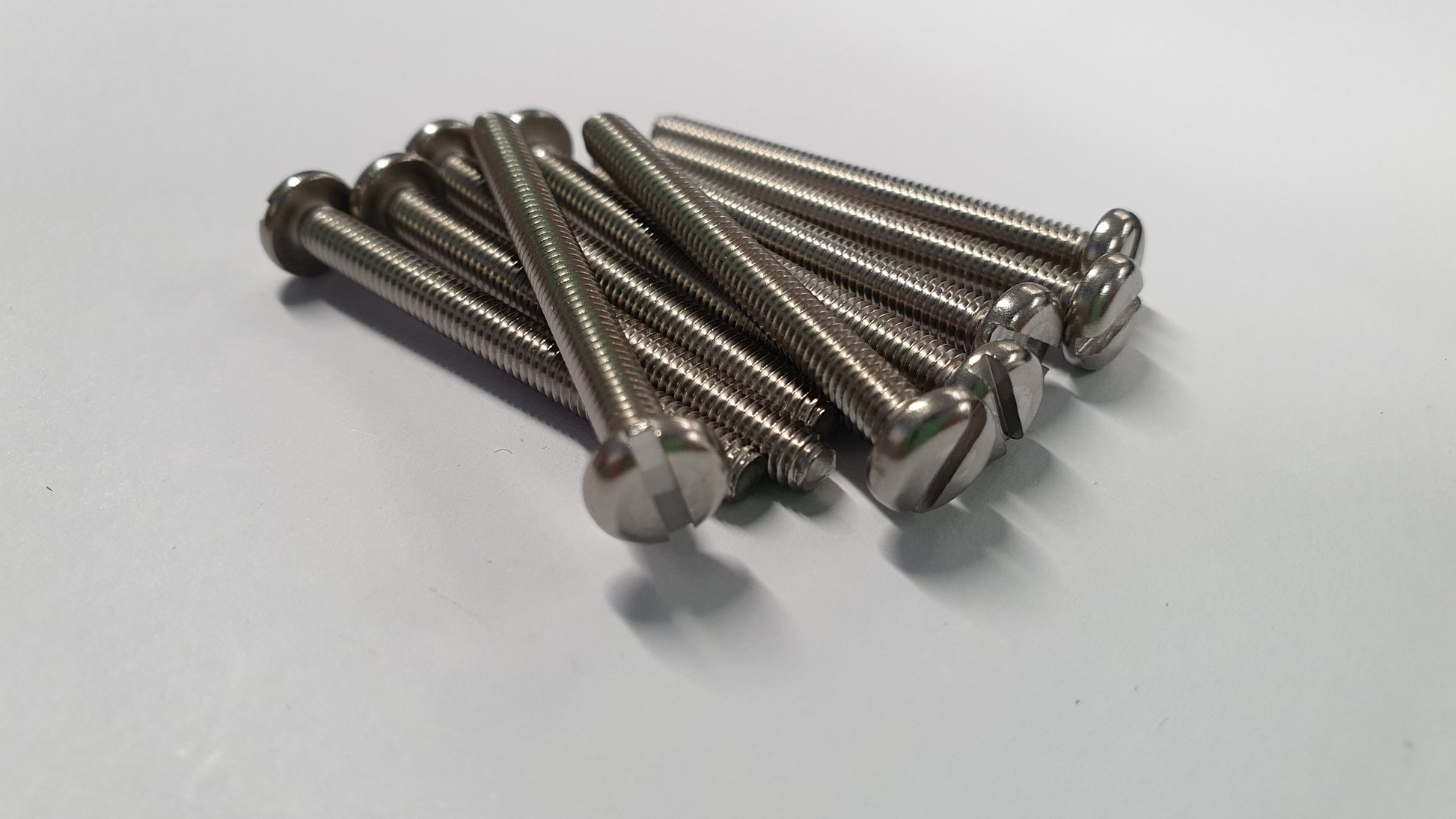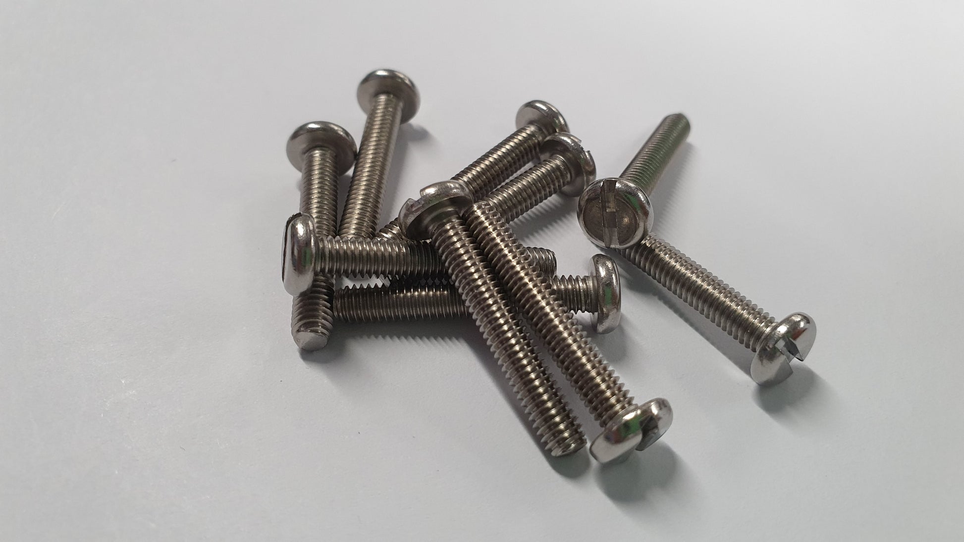 Metric M4 pan head machine screws with 0.7mm thread pitch. Slot/flat blade head.