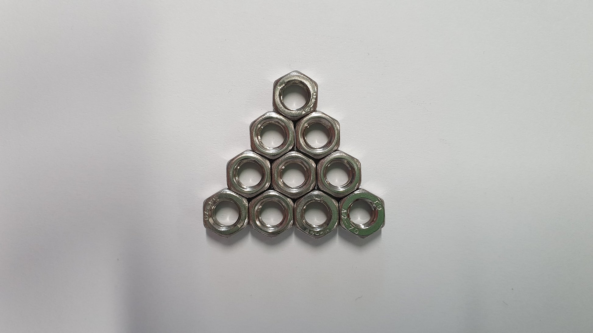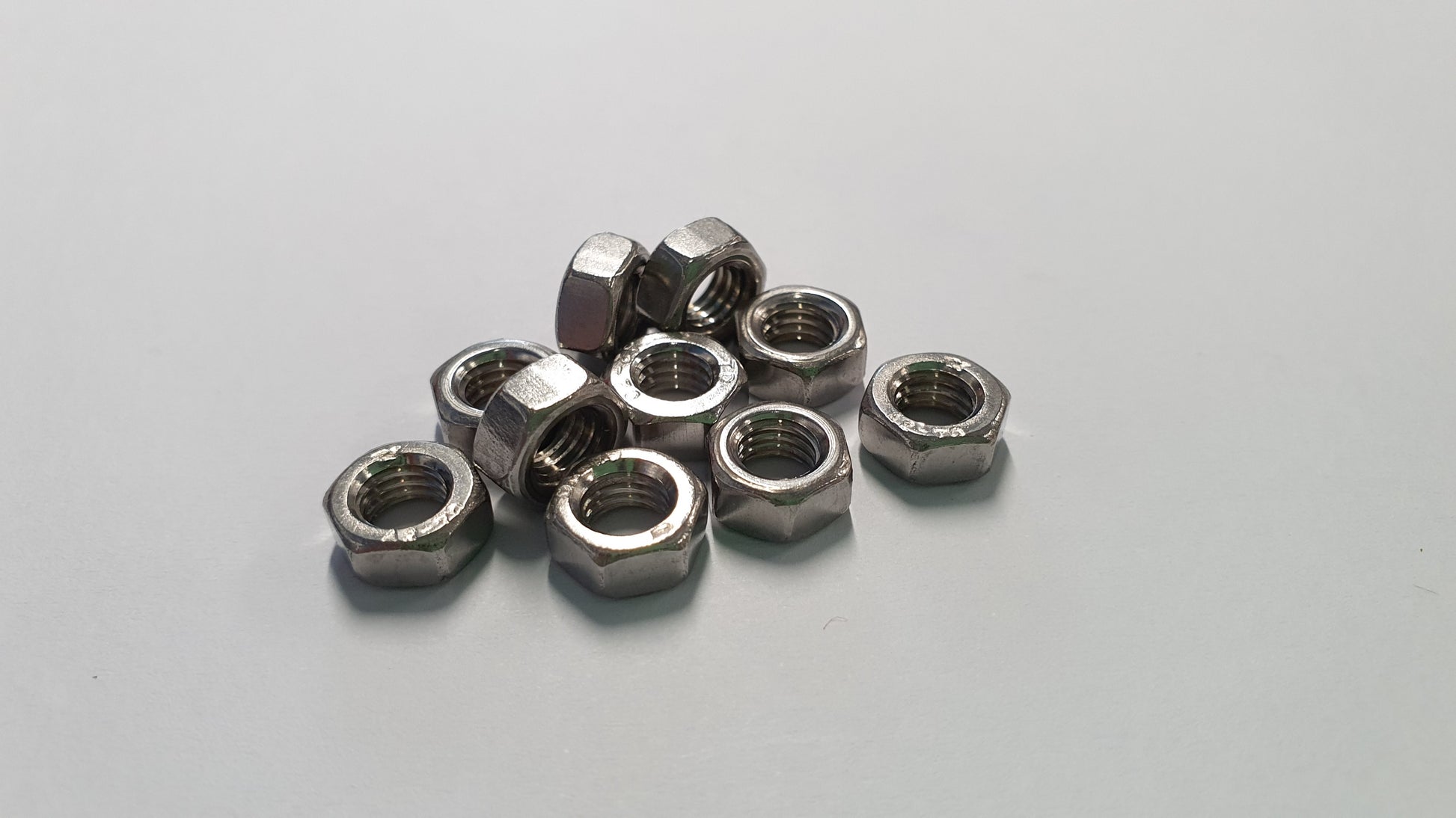 Metric M5 hexagonal full nuts with 0.8mm thread pitch. Head is 8mm across flats.